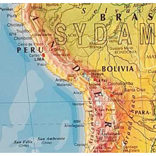 Topografisk.Visar berg och bergskedjor samt djup i hav.