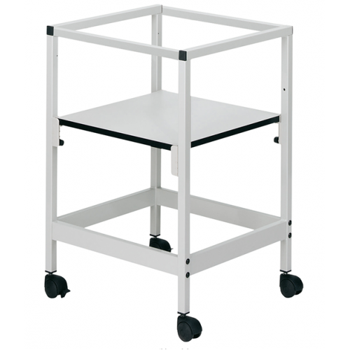 Tillverkat i vitlackerat 4-kantsstål.4 st hjul varav 2 st är låsbara.Bordet är inställbart i 3 st olika höjder: 45/54/70 cm. Mått: B45 x Dj.46 cm Hylla mått: 44,5 x 44,5 cm.Maxlast: 25 kg.
