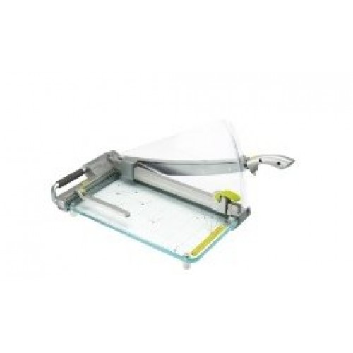 Giljotinskärare med transparent måttindelad härdglasplatta samt skärskydd. Laserstråle visar exakt snittytan.